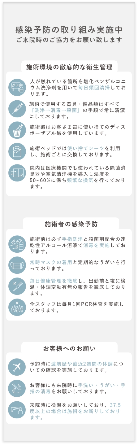 お客様に利用目的をご確認いただいた上で、お客様の個人情報をご登録いただいております。 お客様からご登録いただいた個人情報は、不正アクセスや紛失、破壊、及び漏洩等が起きぬよう、当クリニックで厳重に管理致します。